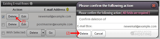 4. Under the Existing E-mail Boxes tab, select the appropriate E-mail address you wish to remove and then click on the Delete button.