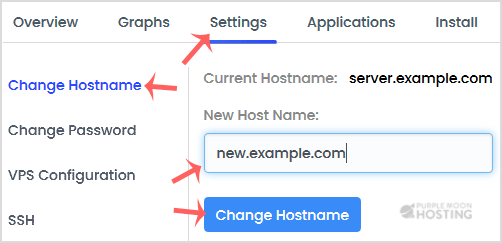 4. Click on the Settings tab, and under the Change Hostname option, enter your new hostname. Then click Change Hostname.
