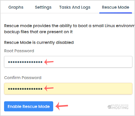 It can take a few minutes to enable rescue mode. After that, you can access your VPS in this mode via SSH with your new password. In case SSH is not accessible, you can access it from VNC.